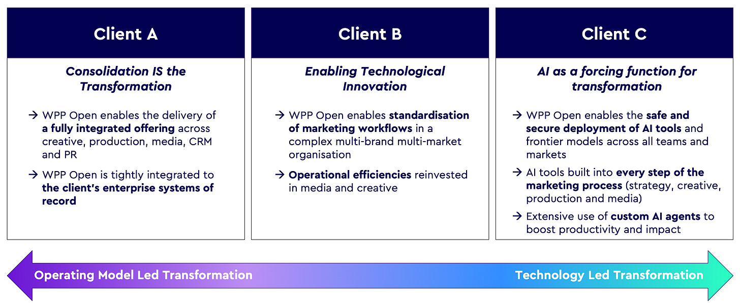 One of the things I talked about previously was how WPP Open would likely lead to lower client churn, and WPP more or less validated today that they believe the same. Look at Client A - tight integration into the client’s ERP system sounds like an incredible way to build retention. ERP is about the stickiest thing there is. In Client B they talked about establishing themselves in client workflows - also sticky. While in Client C they specifically referenced the formation of a “sticky” relationship through technology services. One can’t really overstate the importance of lowering client churn while also becoming more important to the client.